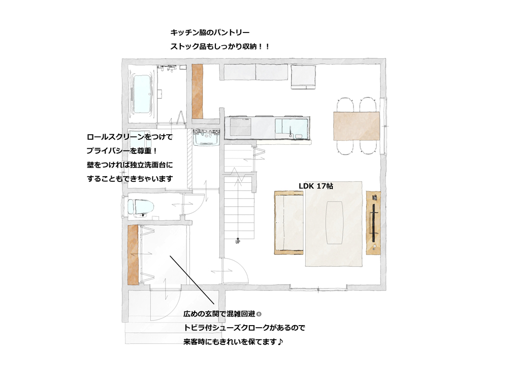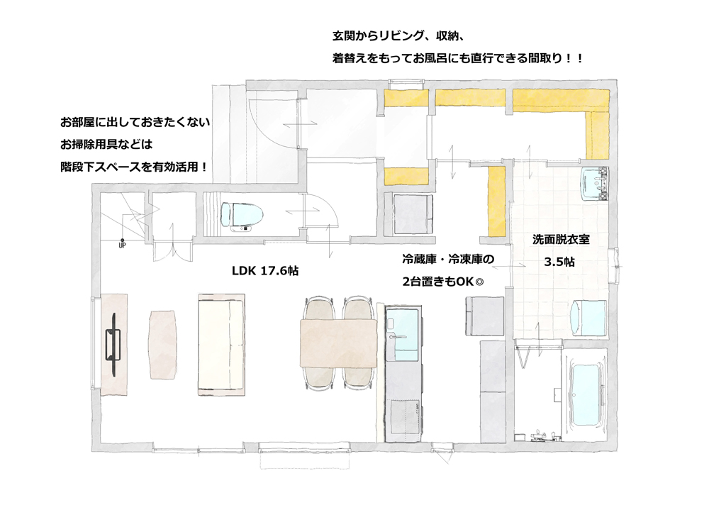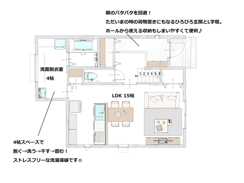 ただいまからの動きをぎゅっとまとめた動線特化のプラン。すぐくつろぎたいときも買い物帰りの収納も、ただいまお風呂も混雑なくスムーズに動けます。洗面脱衣室の隣の収納をランドリー空間にすることも可能なため、お洋服が多いおしゃれさんにもぴったりです。