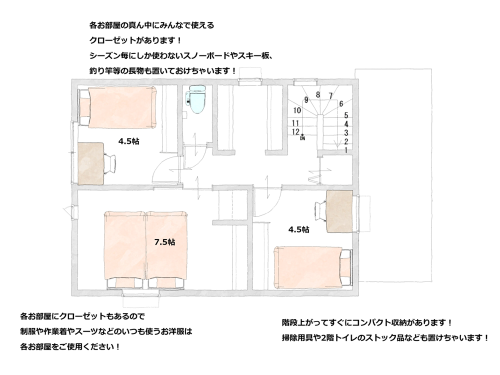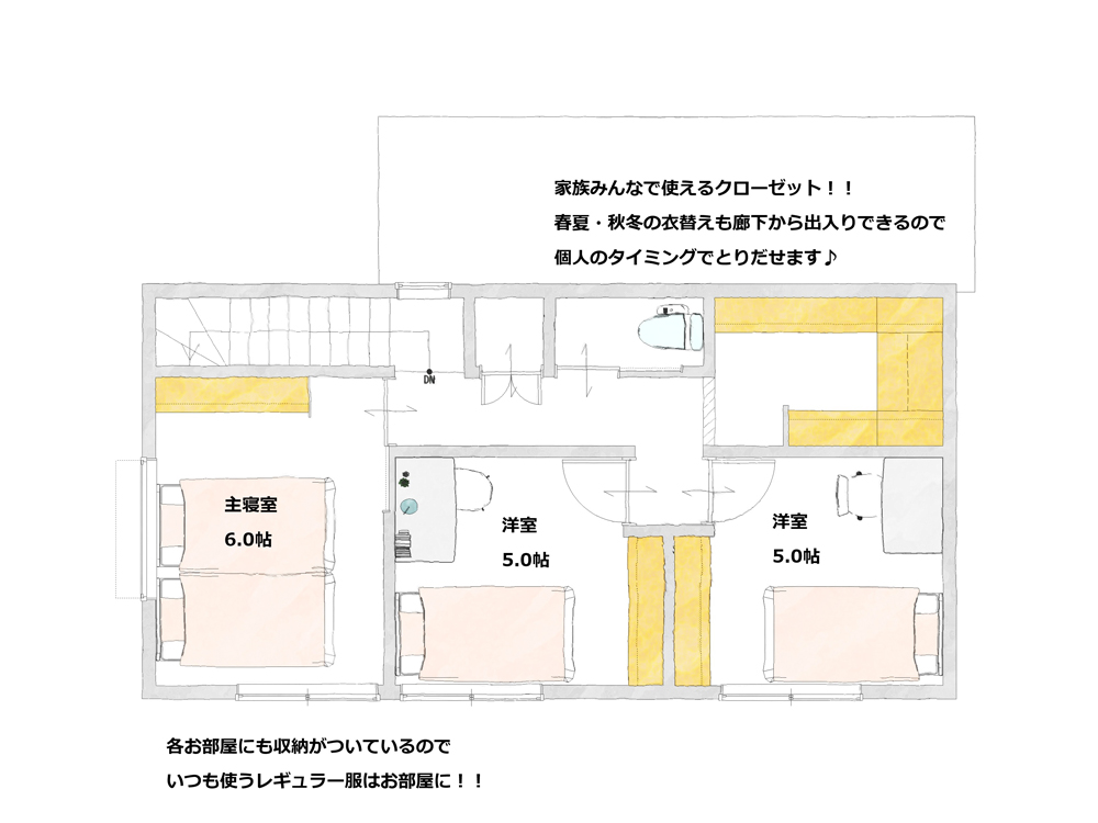 隠せる収納や広め玄関でお客様が来た際にもすぐ片づけられるし抜け感があってなんかいいね!と言ってもらえるような間取りになっています。